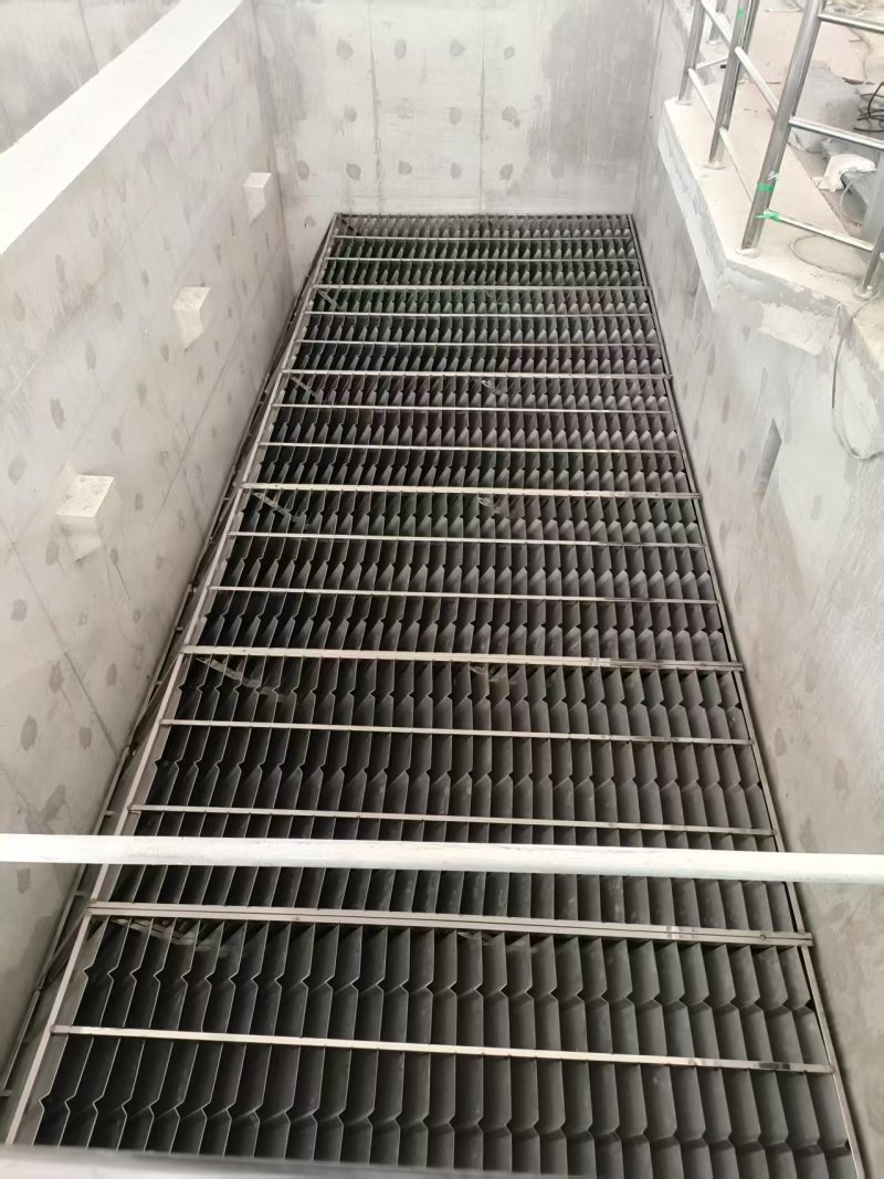 側向流固定式牽拉式斜板概述:固定式牽拉式斜板是有懸掛式斜板發展起的用側向流沉淀池的斜板。這種斜板較之懸掛式斜板,整體性好,斜板組合更加穩固。根據用戶的需要,我們研發了不同材質的固定式牽拉式斜板組??筛鶕匦烷L、寬、高,自由組合斜板泥水裝置。使玉泉公司的固液分離斜板(斜管)的門類更加齊全,能滿足不同池型、不同用戶需求。