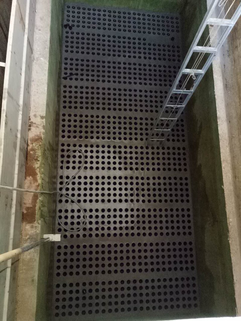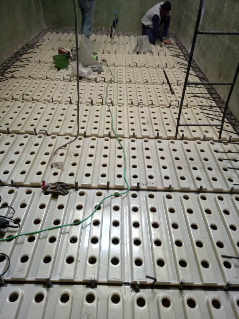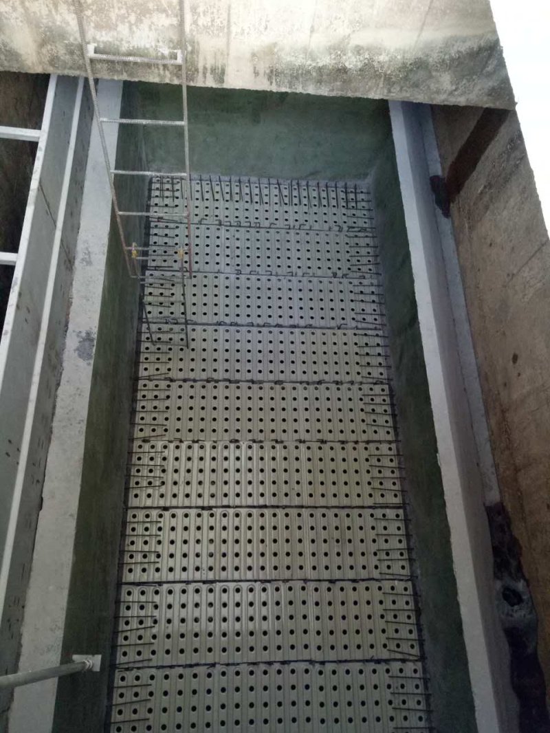 整體澆筑濾板與池體融為一體,沒有任何接縫,強度高。通過調節濾桿可調整濾頭水平度,調整精度高,可將整個濾池的布氣孔調整到同一水平高程,使配氣布水更趨均勻。整體澆筑的混凝土濾板的控制指標與常規土建工藝相近,簡化了施工程序,并可提高機械化施工程度,縮短了施工周期,降低了工程造價。
